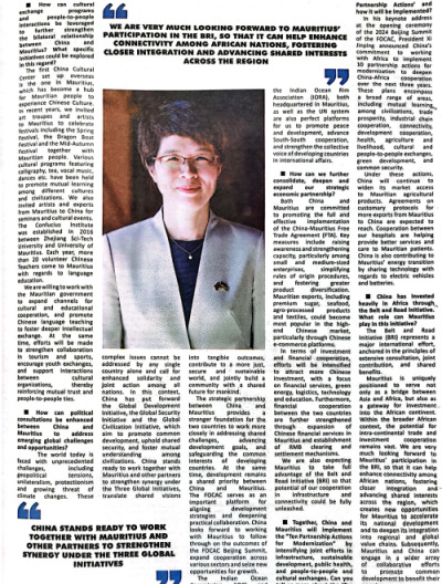 In her latest interview with Le Défi Media Group on May 25, Ambassador Huang Shifang made remarks on bilateral relations between China and Mauritius.
