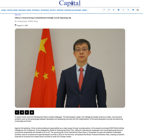 Amb. Jiang Feng, Head of the Mission of China to the African Union, published an op-ed entitled China’s Unwavering Commitment to High-Level Opening-Up in Ethiopian Capital Newspaper, on August 21. The full text is as follows: