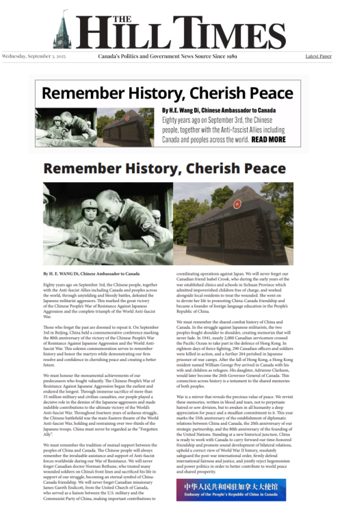 On September 3rd, 2025, Chinese Ambassador to Canada Wang Di published a byline article titled "Remember History, Cherish Peace" on the Hill Times. The full article is below: