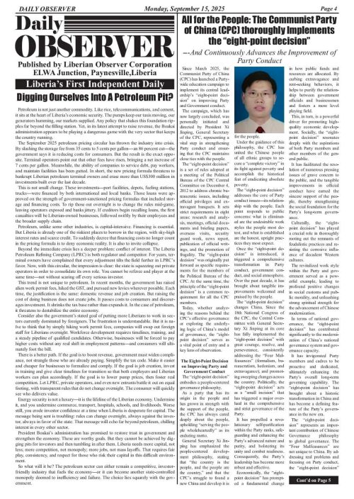 On September 15, 2025, Ambassador Yin Chengwu published an article entitled “All for the People: The Communist Party of China (CPC) thoroughly Implements the ‘eight-point decision’ and Continuously Advances the Improvement of Party Conduct” in the Liberian newspaper of Front Page Africa, Daily OBSERVER, The NEWS, and The NewDawn, actively introducing the“eight-point decision” to all sectors of Liberian society. The full text reads as follows:
