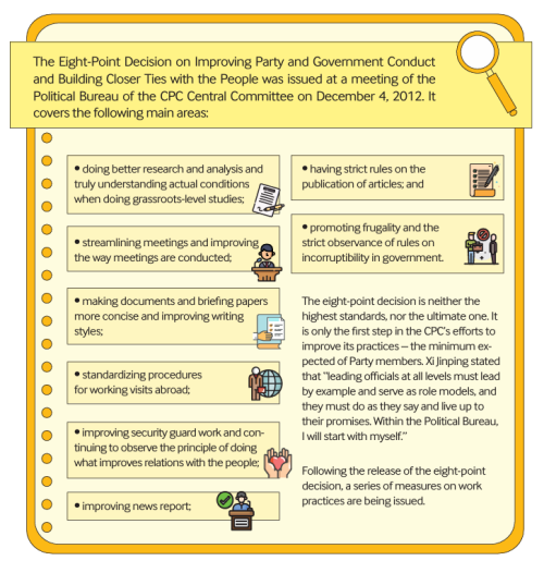 The “eight-point decision” is a set of rules adopted at a meeting of the Political Bureau of the CPC Central Committee on December 4, 2012 to address chronic bureaucratic issues, including official privileges and extravagant banquets. It sets strict requirements in eight areas: research and analysis, meetings, official documents and briefing papers, overseas visits, security guard work, news report, publication of official writings, and the promotion of frugality. The “eight-point decision” was originally put forward as specific requirements for the members of the Political Bureau of the CPC. At the same time, the principle of the “eight-point decision” is a common requirement for all the CPC members.