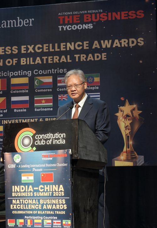 On December 12 2025, Ambassador Xu Feihong was invited to attend the “India–China Business Summit 2025” hosted by the Global India Business Forum (GIBF) and delivered a keynote speech.