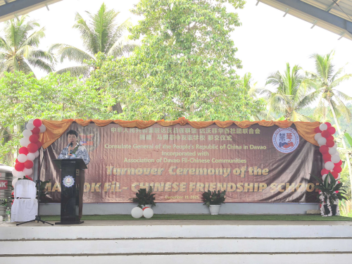 On behalf of the Chinese Consulate General in Davao, I wish to extend my warm congratulations on the school’s successful completion. I would like to express my gratitude to the Association of Davao Filipino-Chinese Communities and the individuals who contributed funds and efforts to the school's construction, as well as to the government and the school administration for their assistance throughout the project.