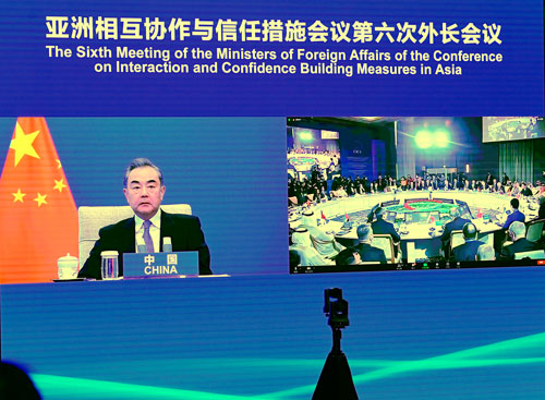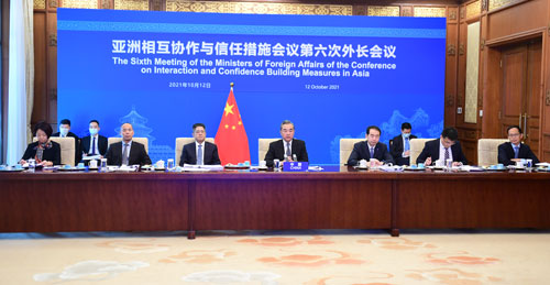 On October 12, 2021, State Councilor and Foreign Minister Wang Yi attended the Sixth Meeting of the Ministers of Foreign Affairs of the Conference on Interaction and Confidence Building Measures in Asia (CICA) via video link and delivered a speech themed "Leveraging the CICA's Cooperation Advantages and Building an Asian Community with a Shared Future".