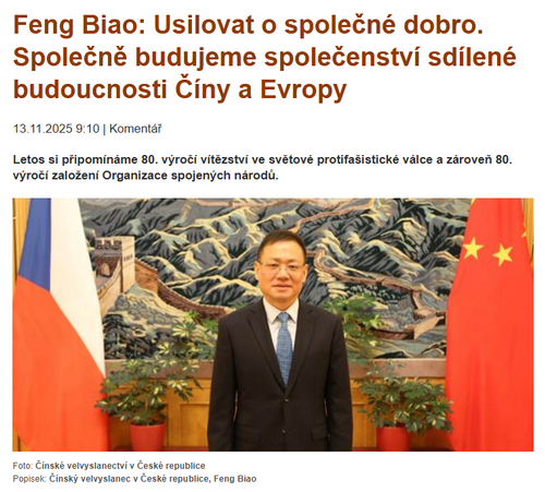 Dne 13. listopadu 2025 publikoval velvyslanec Čínské lidové republiky v České republice Feng Biao v českém médiu Parlamentní Listy článek „Usilovat o společné dobro: Společně budujeme společenství sdílené budoucnosti Číny a Evropy“. V němž zdůraznil, že koncept „společenství sdílené budoucnosti lidstva“ je čínskou odpovědí na otázku, jaký svět chceme a jak jej vytvářet, a že tento koncept prochází zásadní proměnou od „sólisty“ k „mnohohlasému sboru“. Článek zdůraznil, že Čína a Evropa by měly a také mohou být partnery v díle společného budování společenství sdílené budoucnosti pro lidstvo, přičemž vysoce kvalitní společné budování iniciativy Pás a stezka se stává živou praxí budování čínsko‑evropského společenství sdílené budoucnosti. Článek rovněž představil ducha čtvrtého plenárního zasedání 20. Ústředního výboru KS Číny a uvedl, že trvalý postup čínské modernizace nevyhnutelně poskytne široké příležitosti pro společné budování čínsko‑evropského společenství sdílené budoucnosti. Celý článek je následující: