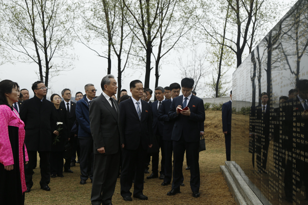 В четырех братских могилах на территории мемориального комплекса покоятся 1383 воина-добровольцев, героически погибших в ходе Войны сопротивления американской агрессии и оказания помощи корейскому народу. На верхней и боковых частях каменной арки при входе на кладбище выгравированы золотые иероглифы: «Кладбище павших героев Китайских народных добровольцев» и «Сопротивление американской агрессии и оказание помощи корейскому народу, защита дома и Отечества». На монументе из белого мрамора начертаны четыре крупных красных иероглифа: «Вечная слава героям». Под звуки государственных гимнов Китая и КНДР в исполнении корейского военного оркестра почетный караул торжественно вынес корзины с цветами на платформу. На лентах цветочных корзин было написано: «Вечная слава павшим героям Китайских народных добровольцев». Ван И и члены делегации почтили память павших героев Китайских народных добровольцев поклоном и минутой молчания, а также осмотрели Стену памяти, выразив глубочайшее почтение павшим добровольцам.