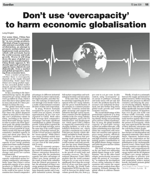 2024年6月10日,驻珀斯总领事龙定斌在澳共《卫报》发表署名文章《坚决反对以“产能过剩”之名损害经济全球化》,指出部分国家炒作中国新能源产品“产能过剩”毫无道理,不过是精心炮制的话题陷阱,试图以此推行单边主义、实施贸易保护,势必严重损害世界经济和贸易增长,拖累全球绿色转型步伐。号召以市场眼光和全球视野,从经济规律出发,客观、理性、全面看待全球新能源产业发展,践行真正的多边主义,促进产业合作、实现互利共赢,携手推动全球绿色发展。全文如下: