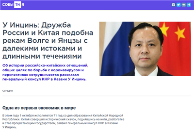 2020年10月1日,为庆祝中华人民共和国71周年华诞及中俄建交71周年,驻喀山总领事吴颖钦在俄罗斯媒体《鞑靼斯坦通讯社》发表署名文章《中俄友谊如长江伏尔加河之水源远流长》。全文如下: