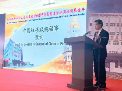 很高兴应邀出席极乐寺开山130周年庆暨慈善医院落成典礼,首先我谨代表中华人民共和国驻槟城总领事馆表示祝贺!