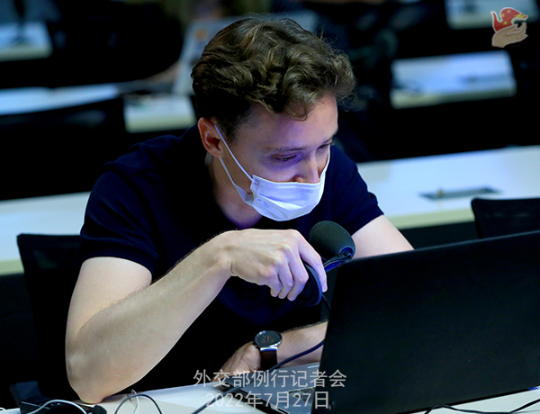 赵立坚:我注意到受季风影响,巴基斯坦俾路支等省遭遇多轮强降雨侵袭,引发洪涝灾害。作为巴方患难与共的好朋友,中方急巴方之所急,第一时间向灾区援助了一批粮食包、小型太阳能发电设备等人道主义物资,帮助当地民众渡过难关。我们相信巴基斯坦政府和人民一定能够战胜洪灾,早日重建家园。我们也愿继续为当地社会发展和民生改善提供力所能及的帮助。