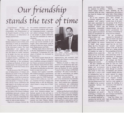 2017年10月31日,驻安提瓜和巴布达大使王宪民在安巴《加勒比时报》发表题为《中安友谊历久弥坚》的署名文章,祝贺安巴独立36周年。全文如下: