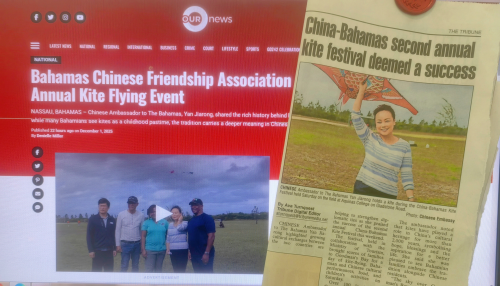 2025年11月29日,驻巴哈马大使严家蓉出席巴哈马—中国友好协会举办的风筝节并接受媒体采访。巴卫生部长达维尔、巴中友协主席莫克西、巴外交部副总司长琼斯、《论坛报》总编利和巴各界百余人参加。