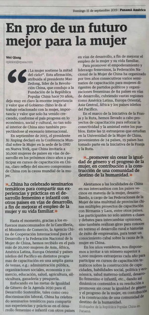 2019年9月15日,巴拿马主流媒体《美洲报》刊登驻巴拿马大使魏强署名文章——《为了妇女事业更好的明天》。全文如下: