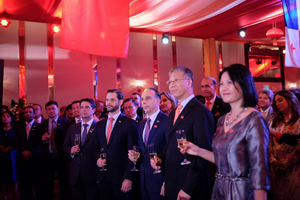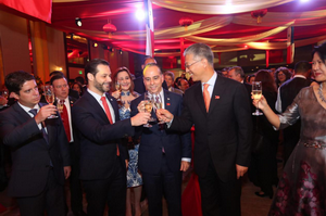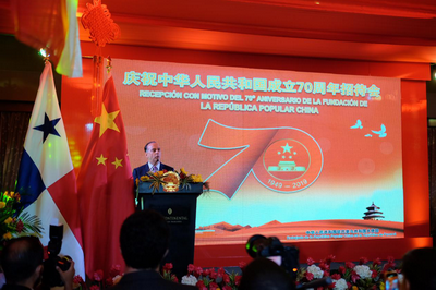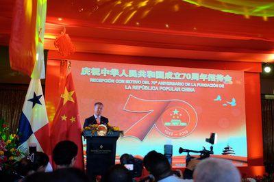 2019年9月19日晚,驻巴拿马使馆在巴拿马城举办招待会,隆重庆祝中华人民共和国成立70周年。巴外长费雷尔、副外长阿尔法罗、工商部长马丁内斯、住房部长萨姆迪奥、农业部长巴尔德拉马等政府官员,国会第一副主席罗淑丽、第二副主席罗德里格斯及多位国会议员、最高法院大法官、巴拿马省省长戈拉哈莱斯、候任驻华大使甘霖、前政要、政党代表、社会各界人士、各国驻巴使节、智库媒体、中资企业、华人华侨代表和巴拿马大学孔子学院师生等500余人出席。
