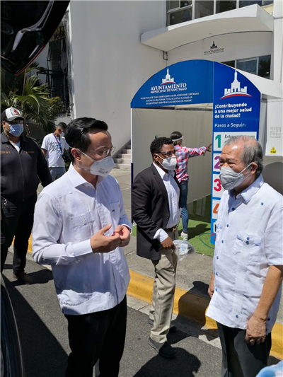 2020年5月15日,驻多米尼加大使张润应邀访问多米尼加第二大城市圣地亚哥市,会见马丁内斯市长并共同出席驻多使馆和旅多侨界抗疫物资捐赠仪式,该市侨团主席岑顺钦及部分侨界代表在场。