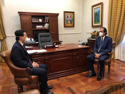 2020年7月28日,驻多米尼加大使张润会见多米尼加总统府部长蒙塔尔沃,双方就两国务实合作交换意见。