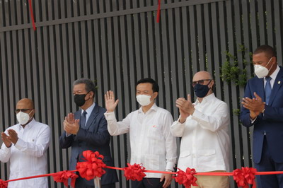 2020年10月1日,国庆、中秋双至,在这个举国同庆的喜庆日子,驻多米尼加使馆隆重举行新馆启用仪式。驻多米尼加大使张润及多米尼加前总统费尔南德斯,前总统、执政党现代革命党领导人梅希亚,众议长帕切科,副参议长索里亚,外长代表、副外长戈麦斯,高等教育和科技部长加西亚,工贸和中小企业部长比索诺,公共工程部长阿森西翁,青年部长塔维拉斯,地区一体化政策部长梅西亚,总统府部及国防、卫生、文化等部副部长及当地企业界、学术机构、中资企业协会、华侨总会代表等出席。张润大使同主要嘉宾在使馆大楼前共同为新馆剪彩。