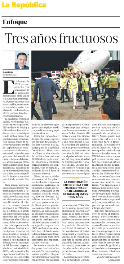 2021年5月3日,驻多米尼加大使张润在当地最大报《里斯汀报》发表题为《硕果累累的三年》的署名文章。全文如下: