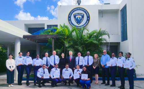 2025年11月21日,驻多米尼加大使陈鲁宁及夫人出席多旅游警察中文培训班结业仪式。旅游警察局长松永实等参加。