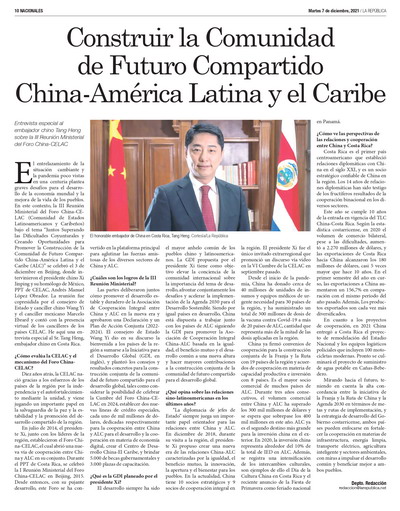 2021年12月7日,驻哥斯达黎加大使汤恒就刚刚召开的中拉论坛第三届部长会议接受当地媒体《共和国报》专访。汤大使指出,元首外交始终对中拉关系发展发挥重要引领作用,习近平主席向会议发表视频致辞,欢迎拉方积极参与全球发展倡议。中拉论坛成立7年以来蓬勃发展,已经成为汇聚中拉各界友好力量的主要平台。中拉同属发展中国家,中方愿同拉方一道,以全球发展倡议为指引,推动平等互利、共同发展的中拉全面合作伙伴关系取得新的更大发展,为构建全球发展命运共同体贡献更多中拉力量。采访全文如下: