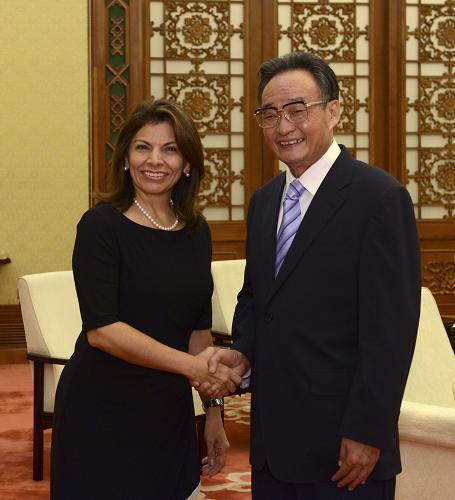 2012年8月17日,中国全国人大常委会委员长吴邦国在人民大会堂会见哥斯达黎加总统钦奇利亚。
