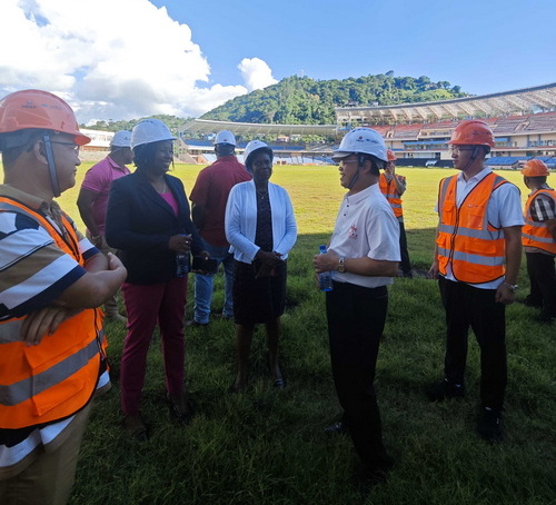 2024年10月2日,驻格林纳达大使韦宏添与格林纳达新任青年和体育部长德尔玛·托马斯一起赴中国援格国家板球场维修项目考察,听取项目组中方负责人和格国家体育场管理局局长工作汇报,并现场察看了施工进展情况。