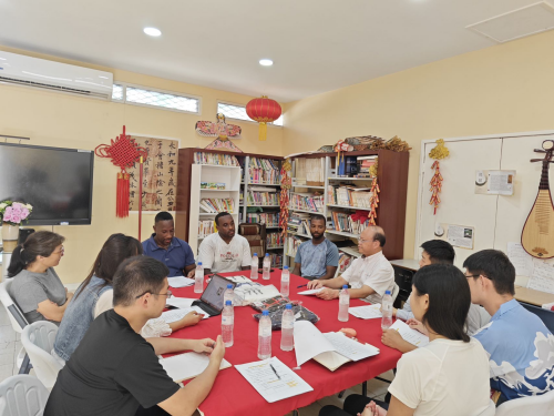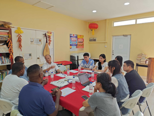 2024年11月14日,驻格林纳达大使韦宏添在格林纳达玛丽秀社区大学孔子学院与格当地中国武术教练、孔子学院老师座谈交流。