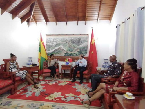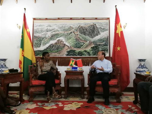 2024年11月29日,驻格林纳达大使韦宏添在官邸与格林纳达参议长威廉姆斯博士及其下属进行座谈交流。