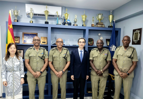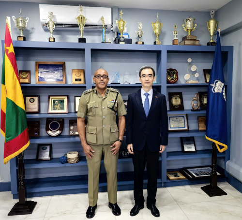 2025年10月16日,驻格林纳达大使杨舒到任拜会格林纳达皇家警察部队总监康诺特,双方就中格警务合作交流意见。