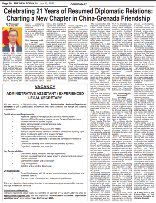 2025年1月21、23日,驻格林纳达大使杨舒在格林纳达媒体“今日格林纳达”网、《新今日报》《信息报》发表署名文章《庆祝复交21周年:谱写中格友好新篇章》,祝贺中格复交21周年,回顾21年来双边关系发展并展望两国友好合作未来。