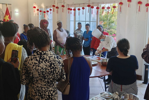 活动现场,中外嘉宾品茗聆乐,欣赏使馆厨师精妙的水果雕花技艺表演,又携手协作包春卷、做红豆酥,彼此畅谈互动、笑语盈盈,氛围热烈融洽。