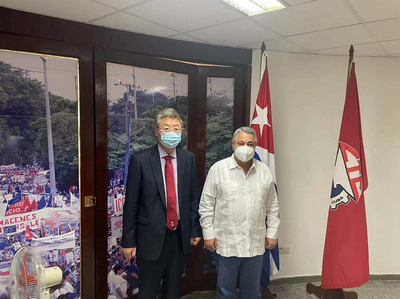 2021年12月9日,驻古巴大使马辉在古巴劳动者宫会见古巴共产党中央政治局委员、工人中央工会总书记吉拉特,就中古两党两国关系、两国工会组织交流合作等交换意见。