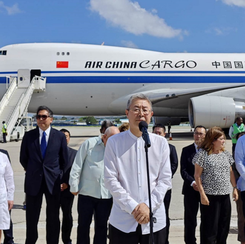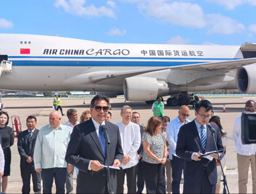 2024年4月3日,中古双方在哈瓦那举行中国政府紧急粮食援助首批物资交接仪式。驻古巴大使马辉陪同在古访问的国家国际发展合作署署长罗照辉出席。