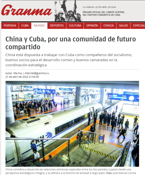 2024年4月21日,古共中央机关报《格拉玛报》刊登驻古巴大使马辉署名文章《携手共建中古命运共同体》。全文如下: