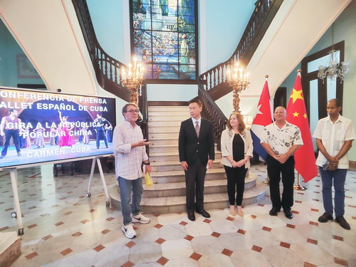 2025年10月22日,驻古巴使馆举行古巴芭蕾舞团2025年度赴华巡演新闻发布会,驻古巴大使华昕、古舞台艺术委员会主席加西亚、古文化部国际司司长吉韦特和新华社、中国国际电视台、古国家电视台、《格拉玛报》等10余家中古主流媒体出席。