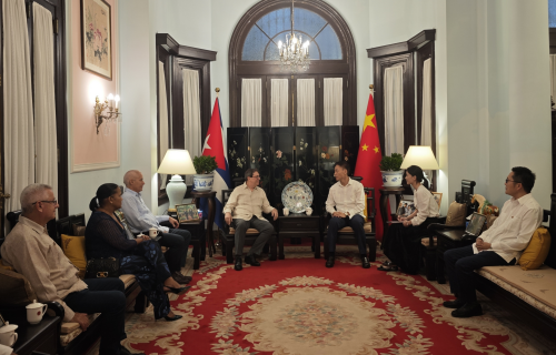 2025年12月19日,驻古巴使馆同古外交部举行新年联谊活动,驻古巴大使华昕出席活动。古共中央政治局委员、古巴外交部长罗德里格斯偕古外交部全体部领导和各主要司局负责人做客中国使馆,与使馆外交官畅叙友谊,欢度新年。