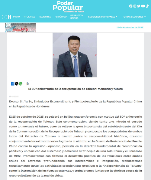 2025年11月12日,驻洪都拉斯大使于波在洪主流媒体《人民权力报》《论坛报》发表题为《台湾光复80周年:铭记历史 走向未来》署名文章,指出中国举办纪念台湾光复80周年大会,既是对历史的回望,也是对未来的宣示。台湾光复纪念日的设立有力巩固世界上只有一个中国、台湾是中国不可分割一部分的国际共识。两岸统一是历史定论、法理必然,也是民心所向、大义所在,更是不可阻挡、不可逆转的时代洪流。全文如下: