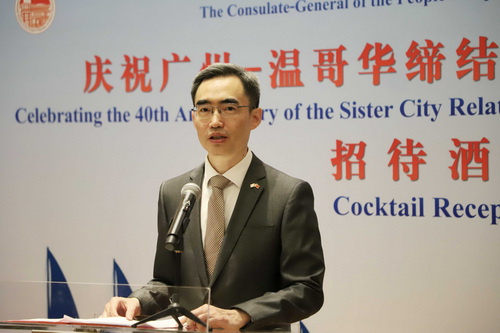 2025年4月18日,驻温哥华总领馆举办庆祝广州—温哥华缔结友城40周年招待酒会,驻温哥华总领事杨舒、广州市文化广电旅游局长刘瑜梅、加拿大枢密院院士黄陈小萍、不列颠哥伦比亚省公民服务厅长周烱华,省议员崔保罗、陈瀚生及领区各界代表60余人出席。随后嘉宾与600余名观众共同观看广州国际友城艺术团演出。