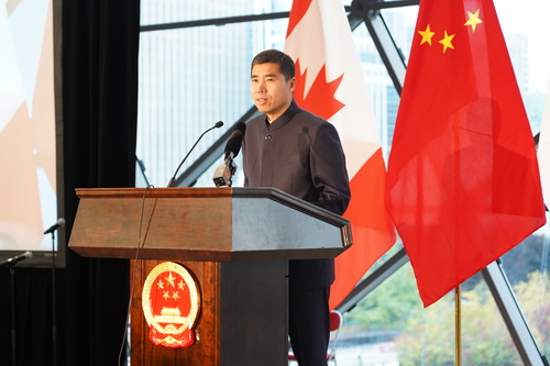 王镝大使在致辞中宣介新中国成立76年伟大成就,回顾中加建交55年和建立战略伙伴关系20年来双边关系历程,强调中方愿同加方认真落实两国总理会见重要共识精神,推动双边关系沿着改善发展正确轨道不断前行。