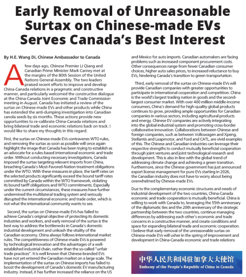 2025年10月6日,驻加拿大大使王镝在加媒体《国会山时报》发表署名文章《尽快取消对华电动汽车不合理关税符合加拿大最佳利益》。全文如下: