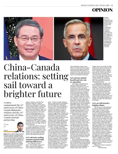 2025年10月13日,驻加拿大大使王镝在加《国会山时报》发表署名文章《风好正扬帆,推动中加关系驶向更美好未来》,纪念中国和加拿大建交55周年、建立战略伙伴关系20周年。全文如下:
