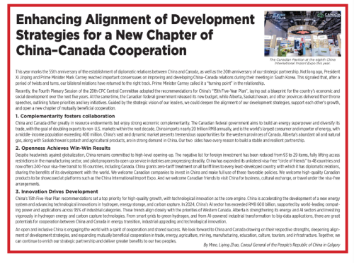 前不久,中国共产党二十届四中全会审议通过了“十五五”规划建议,为今后五年中国经济社会发展规划了蓝图。与此同时,加联邦政府发布新预算案,阿尔伯塔省、萨斯喀彻温省等先后发表省情咨文,提出未来发展目标和重点项目。在两国元首外交战略引领下,我们应加强发展战略对接,在各自发展道路上相互成就,共同谱写中加互利合作新篇章。