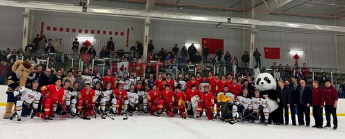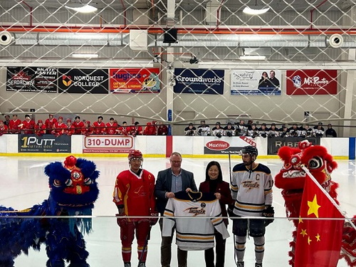 2026年2月5日,驻卡尔加里总领事赵丽莹应邀为前来集训的中国国家男子冰球队与埃德蒙顿康考迪亚大学雷霆冰球队友谊赛开球。康考迪亚大学校长、师生,侨社代表等约500人观看比赛。