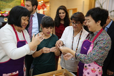 徜徉在中国文化的欢乐海洋中,不知不觉就到了中午时分,墨西哥朋友看见摆上的中式厨具和食材便明白进入了中国美食时段,不禁一阵雀跃欢呼。此前,不少墨西哥朋友看过“舌尖上的中国”节目,多次表示希望能有机会现场观摩一场地道的美食展示。今天,他们如愿以偿地参与了一场真人版“舌尖上的中国”。使馆大厨魏师傅首先展示熟练的炸虾球功夫,“小小虾米球,为尔口水流”,虾米经油锅翻滚之后顿显粉红透亮、分外诱人,一些墨西哥朋友迫不及待地品尝一番。另一些墨西哥朋友一边聚精会神地观看两位使馆女馆员包饺子,一边饶有兴趣地听她们介绍饺子的历史和制作工序。现场友人兴趣浓厚,踊跃报名,上场向中国师傅学习包饺子技艺。中墨“团队合作”非常默契,不一会儿功夫,一盘水饺即飘香出锅。煮好的饺子静静地躺在青花雕盘里,宛如娇羞的花朵,几个墨西哥朋友轻轻尝了一口,立刻竖起了大拇指,“这才是正宗的中国饺子”。此时,细心的友人发现自助餐已在大厅一侧摆放,香飘十里的美食盛宴虚席以待。热气腾腾的中式菜品瞬间成为耀眼明星:碧绿虾球酥脆鲜香,吉利鱼柳风味醇厚,麻婆豆腐劲辣可口,双色菜花鲜嫩清爽,什锦炒饭浓香透亮。与此同时,大厅开始播放纪录片《鸟瞰中国》。“闻香下马,知味停车”,大家一面欣赏纪录片里美不胜收的景观、风光旖旎的山水,一面品尝芳香四溢、色香味美的珍馐。“中国发展太快了,城市好繁华,生活真是丰富多彩 ”,当看见纪录片里的上海东方明珠时,旁边的墨西哥小姑娘不无羡慕地感慨道......