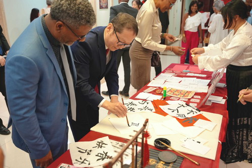 活动现场气氛热烈友好,来宾共同参观马年生肖文化展,体验书法、剪纸等中国传统文化项目,欣赏钢鼓、中国舞等精彩演出,纷纷向中国人民致以节日问候,祝愿两国关系在农历马年蒸蒸日上,合作结出更多硕果。