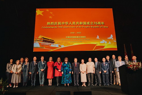 2025年9月26日,驻阿德莱德总领馆举办庆祝中华人民共和国成立76周年招待会,驻阿德莱德总领事李东,南澳州州长代表、旅游和多元文化事务部长贝蒂森出席并发表讲话。南澳州反对党副领袖蒂格议员,多位联邦议员与各界嘉宾及华侨华人近300人参加。