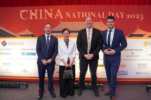 2025年10月1日,驻珀斯总领事付莉华出席澳大利亚中国工商业委员会西澳分会与澳大利亚中国总商会珀斯分会共同举办的中国国庆酒会并致辞。州矿业部长迈克尔、澳贸委西澳办主任卡福里奥及政商界代表300余人出席。