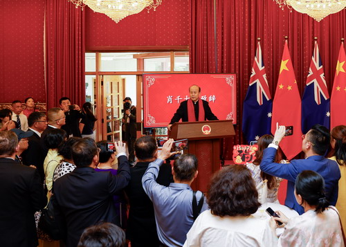 2026年2月11日,驻澳大利亚使馆在馆内举行春节招待会,驻澳大利亚大使肖千出席,与澳大利亚首都华人社团联合会会长吴鹏辉以及其他百余名侨胞共庆丙午马年新春。