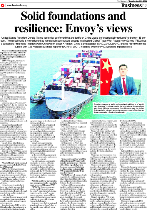 2025年4月24日,驻巴布亚新几内亚大使杨晓光就美滥施关税接受巴新主流媒体《国民报》书面采访,阐明中方严正立场。《国民报》全文刊登杨大使采访内容。