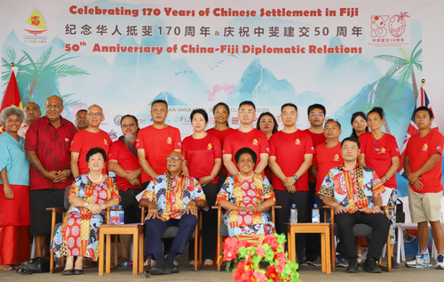 2025年10月25日,斐济华人协会联合各侨团在苏瓦举办纪念华人来斐170周年暨庆祝中斐建交50周年庆祝活动。驻斐济使馆临时代办汪元,斐总理兰布卡出席,斐内阁部长、议员、旅斐各地侨胞、中资机构人员近千人参加。